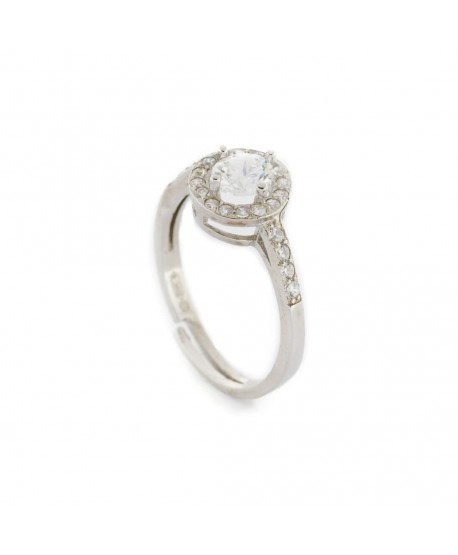 Anello Faga Collection in argento 925 modello solitario con zircone centrale con forma tonda di colore bianco, rubino, verde o blu, contornato da zirconi bianchi.