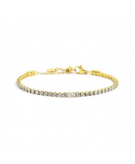 Bracciale in acciaio pvd oro con catena tennis 2,50 mm con zirconi bianchi, con al centro uno zircone baguette bianco. Lunghezza totale 19 cm regolabile tramite cursore da 19 cm a 15 cm. Chiusura a moschettone. Marlù logo tag presente all' estremità. Materiali: acciaio, zirconi, pvd oro Collezione: BEW16