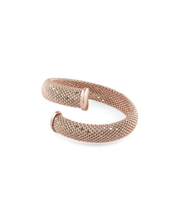 Bracciale rigido contrariè da donna Unoaerre Collezione in bronzo rosato lavorato a tessuto a palline effetto diamantato.