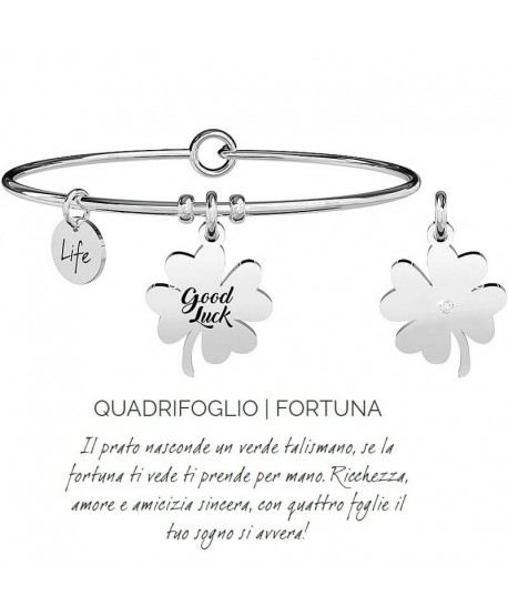 Bracciale Kidult, collezione Nature, rigido in acciaio con chiusura con placchetta con incisione "Luck" e pendente a forma di quadrifoglio con zircone bianco. Disponibile colore argento o oro rosa.