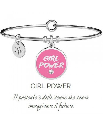 Bracciale Kidult, collezione Philosophy, rigido in acciaio con chiusura tonda e pendente con placchetta tonda con incisione "Never give up" (non mollare mai).