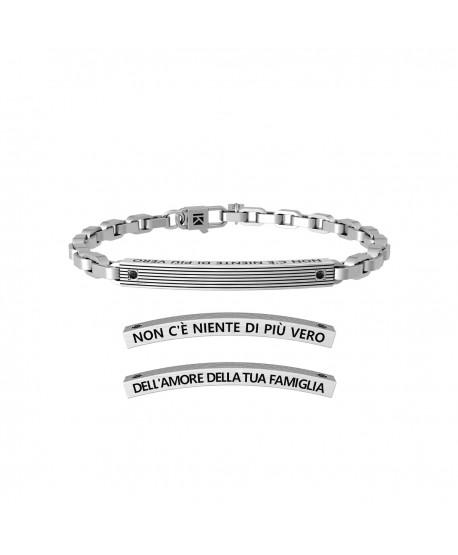 Bracciale in acciaio 316L satinato, catena ovale e piastra con cristalli neri. Scritta: NON C'E' NIENTE DI PIU' VERO DELL'AMORE DELLA TUA FAMIGLIA. Dimensioni: piastra 40x5 mm, maglia larghezza 4.50 mm, cristalli 1,75 mm, lunghezza cm 21