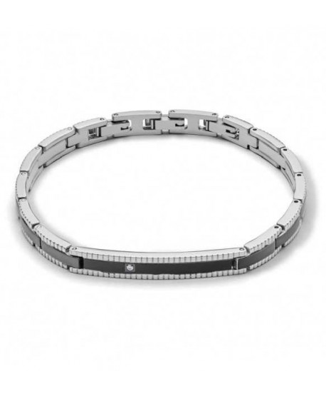 Bracciale Aragonesi Gioielli Collezione Almeria da uomo con maglie in acciaio 316 L, placchetta e componenti cilindriche logate in acciaio con cristalli cubic zirconia neri.
