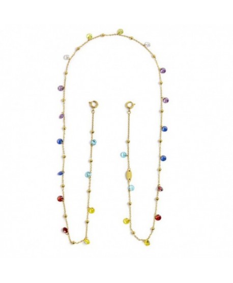 Catena porta occhiali in acciaio con pvd oro con cristalli colorati, lunghezza totale 70 cm. Collezione: ACCESSORI 01 Materiali: acciaio con pvd oro, cristalli