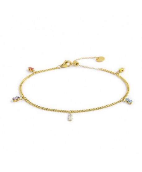 Cavigliera in acciaio con pvd oro con catena grumetta con cristalli baguette colorati. Lunghezza totale 25,8 cm, regolabile da 25,8 cm a 21 tramite cursore. Marlù logo tag presente all'estremità. Materiali: acciaio, pvd oro, cristalli Collezione: ANK05