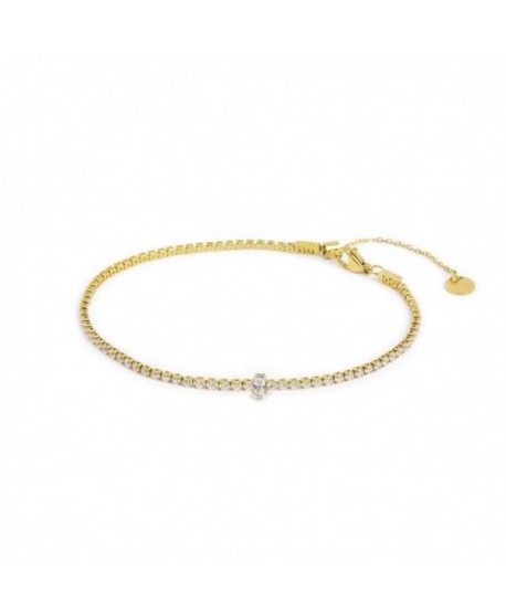 Cavigliera in acciaio con pvd oro con catena tennis 2 mm con cristalli bianchi, con al centro un cristallo baguette bianco. Lunghezza totale 25,8 cm regolabile tramite cursore da 25,8 cm a 20 cm. Chiusura a moschettone. Marlù logo tag presente all' estremità. Materiali: acciaio, pvd oro, cristallo Collezione: ANK05
