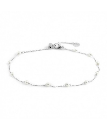 Cavigliera in acciaio con catena con perle bianche con diametro 3 mm, con logo tag Marlù all'estremità. Lunghezza 25,8 cm, regolabile tramite cursore da 25,8 cm a 20,8 cm. Materiali: acciaio, perle Collezione: ANKLE LOOK 03