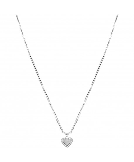 Collana choker in acciaio con catena tennis con zirconi bianchi, con al centro uno zircone baguette bianco. Lunghezza totale 42 cm regolabile tramite cursore da 42 cm a 32 cm. Chiusura a moschettone. Marlù logo tag presente all' estremità. Materiali: acciaio, zircone Collezione: BEW16