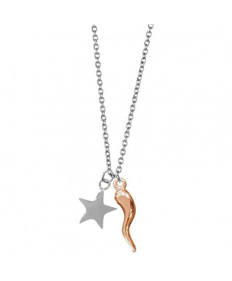 Collana In Acciaio Rodiato Con Cornetto Portafortuna In Bronzo Placcato Oro Rosa E Stellina In Acciaio Rodiato