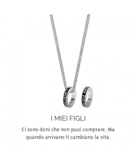 Collana da uomo Kidult, collezione Family, in acciaio con catena grumette, ciondolo a forma di anello con smalto nero ed incisione "I miei figli sono il dono più bello”.