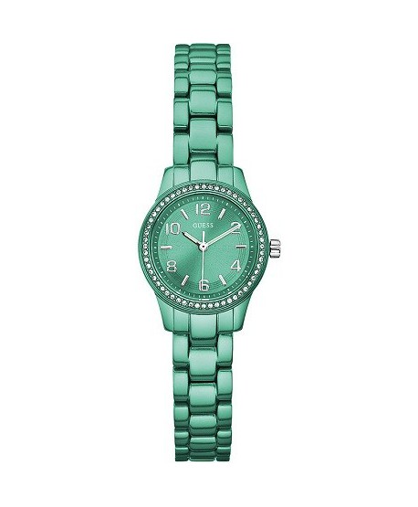 Modello con cassa 44 mm in acciaio e cristalli color argento.Cinturino in silicone fucsia e quadrante con scritta Guess.Resistenza all'acqua 10 Atm e movimento al quarzo analogico.