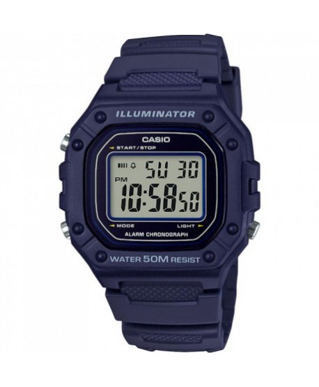 Orologio Casio da uomo della linea Collection. L'articolo W-218H-2AVEF ha movimento al quarzo; realizzato con cassa in resina blu dal diametro di 43 mm con display a luce LED attivabile con il tasto laterale. Il cinturino in resina nera ha una pratica chiusura con fibbia ardiglione. Sul display è possibile visualizzare l'orario in formato 12 o 24 ore, il calendario con giorno e mese. Possibilità di impostare un allarme giornaliero. Cronometro con accuratezza di 1/100 di secondo fino a 1 ora. Questo orologio è impermeabile fino a 50 metri di profondità e la batteria originale può durare circa 7 anni.L'articolo viene spedito completo di confezione originale e garanzia autentica.