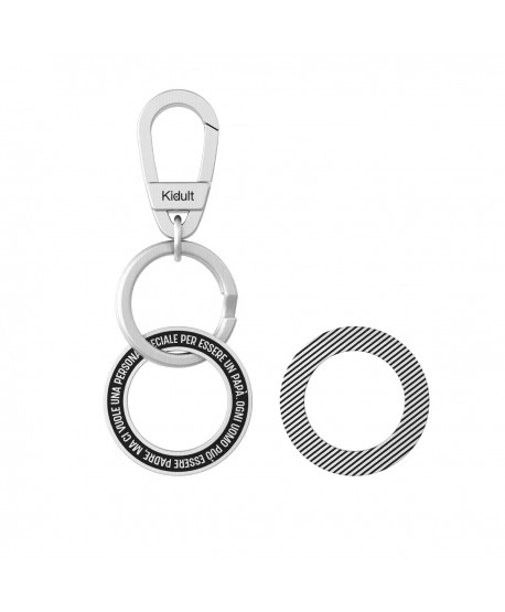 Portachiavi in acciaio 316L satinato con ciondolo tondo in PVD nero con bordo satinato e dietro finitura rigata. Scritta: OGNI UOMO PUO' ESSERE PADRE, MA CI VUOLE UNA PERSONA SPECIALE PER ESSERE UN PAPA'. Dimensioni: moschettone 35 mm, ciondolo tondo 35 m